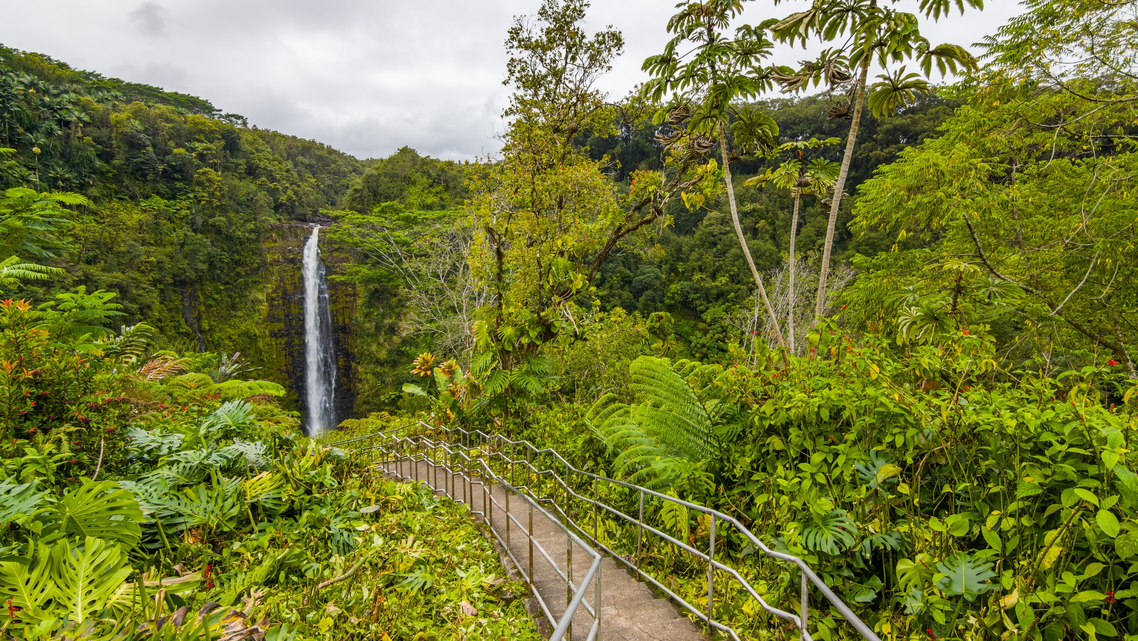 Located along the northeastern Hāmākua Coast, ʻAkaka Falls State Park is home to two beautiful waterfalls. A casual, 0.4-mile hike takes you strolling through an orchid-filled rainforest filled with lush ferns and bamboo trees. The paved footpath winds through this tropical haven toward the Big Island’s most famous waterfall, ʻAkaka Falls, which descends almost 450 feet into the stream below. To get to Akaka Falls, take Hwy 19 north from Hilo for about 20 minutes to the turnoff for Hwy 220 (west). The Hwy 220 turnoff is between the 13-mile and 14-mile posts. Follow the Hwy 220 signs through Honomū Town for about 3 miles. Don’t forget to lock your vehicle and take valuables with you. Enjoy!