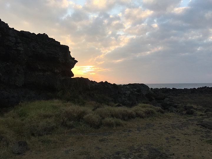 Every picture is perfect here. Layers of the horizon, when looking toward the ocean, change from straw-ochre to plush green, provided by an outcropping of hearty naupaka clusters, that contrast drastically against an inky black silhouette of sharp-edged lava rock. Gnarly rock protuberances segue through a stretch of tide pools into an expanse of liquid blue that meets the sky’s fiery vibrancy of atomic yellow. There’s no silver lining here. It’s more of a celestial caldron boiling up such a flaming brew in the heavens that plump clusters of clouds stand out like a hovering convergence of alien spaceships.