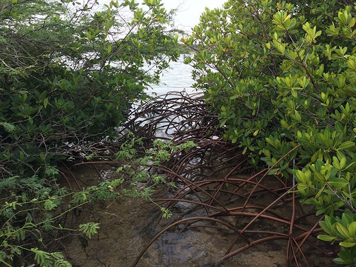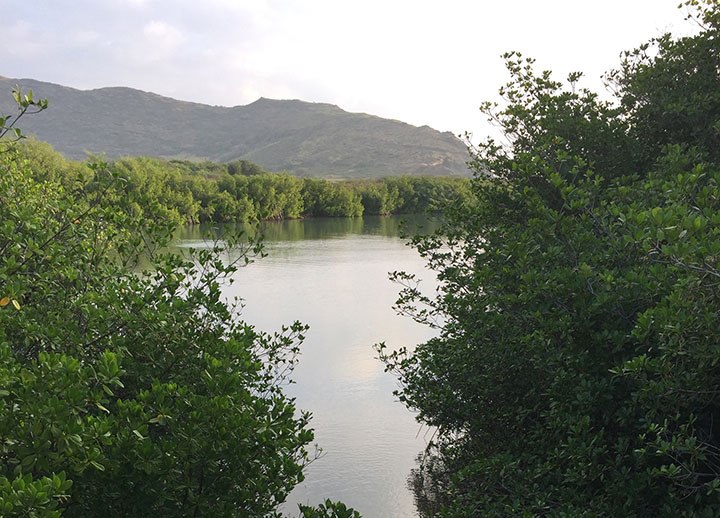 Farther along, as the brightening sky begins to reveal the jagged asymmetry of Koko Crater’s gaping rim in the far distance, Ka‘ili‘ili Bay, on my left, makes its presence known with fingering inlets that present marshy vegetation. Pools have gathered here and there in the flat, inland sands and given rise to surreal clusters of mangroves. Their myriad roots are spindly appendages rising in arching symmetry from the sandy floor of nature’s reflecting pools.