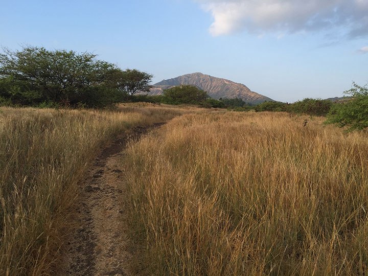 As the path veers away from the beach, there’s a shift from oceanside lava rock to tall, dry, grassy fields, reminiscent of golden African savannah. But here, the gold is doubly vivid, like a glowing vision from a treasure chest, as a flood of rays drenches the rich veneer of the morning across the land.