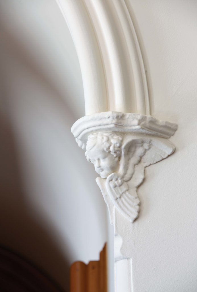 Three different architects were employed by Kal- akaua, in rather quick succession, to design and build the royal palace, the last of which was Isaac Moore. He is largely credited with the decorative work completed in the final stages. In keeping with the Victorian architectural style, tranquil little faces look down upon viewers as part of the ceiling mosaics, and cherubs can be found peeking from the corners of doorframes.