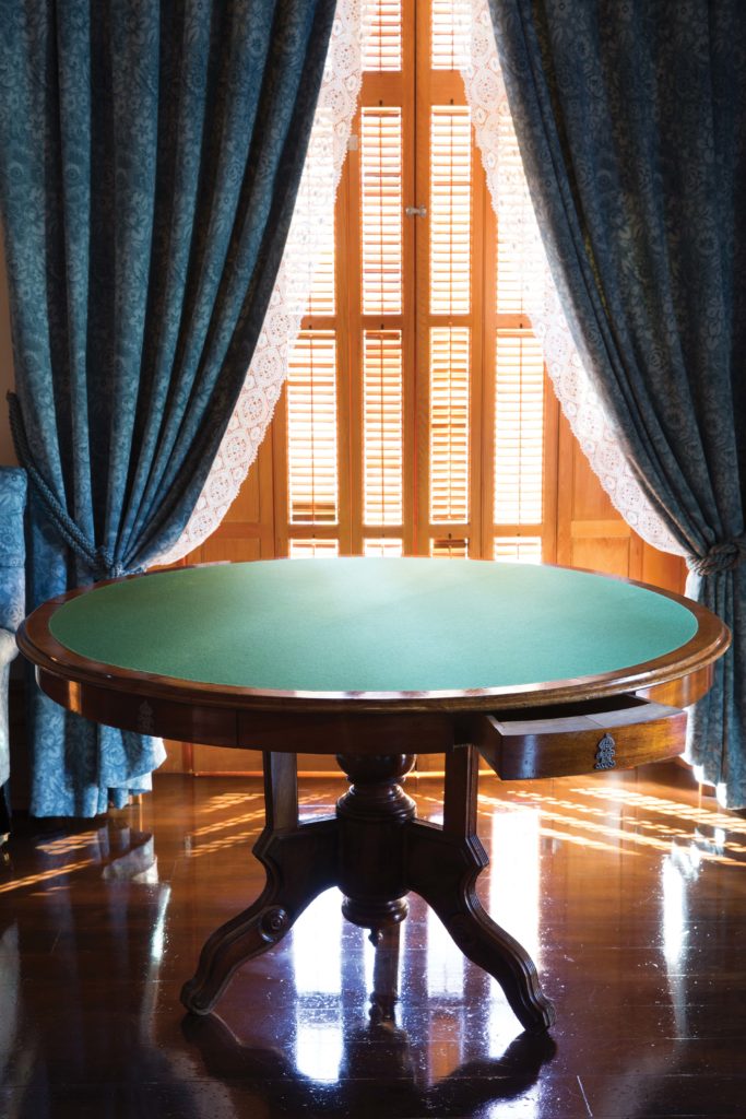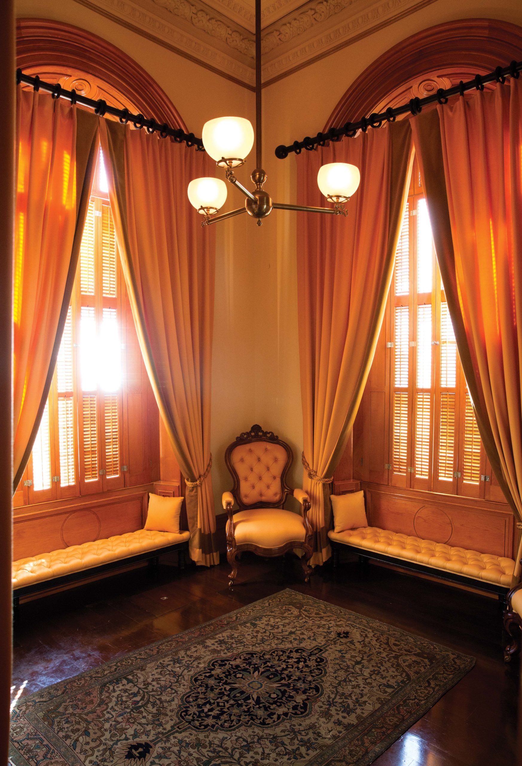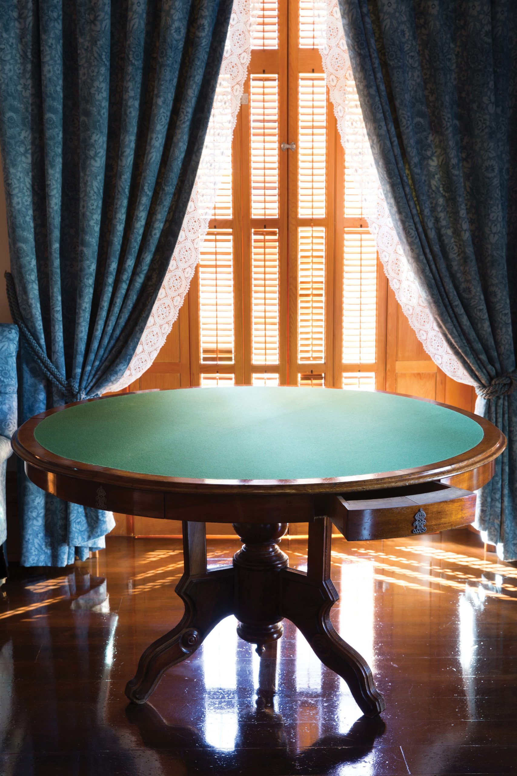 While standing in any one of the main rooms on this floor, look up and spy the crowns within the ceiling motifs. What might not be noticeable at first glance, though, is that one of the four rooms, the King Library, features the crowns facing out versus in. Ac- cording to ‘Iolani Palace curator Heather Diamond, “It makes a statement about where the source of the power really was.”