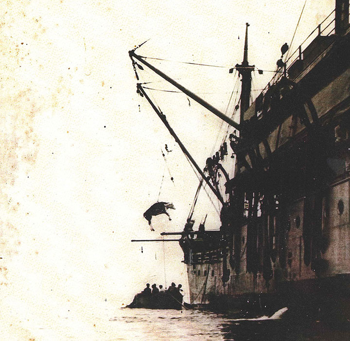 “These saddles were worn in the ocean to get cattle aboard transport ships,” details Nahua Guilloz of Parker Ranch. She says mounted paniolo accompanied swimming cattle, which were tethered to long boats, out to a waiting freighter in Kawaihae Harbor. A crane hoisted the animals up on the ship and Mana Hale has a photo to prove it.